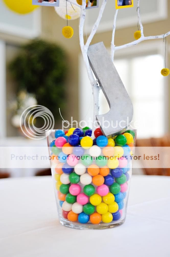 It all started with the colorful centerpieces. The bride and groom cut branches off of a tree and spray painted them white. Then they placed each mini white tree into a vase full of gumballs. The trees were ornamented with photos from Mallory and Josh's dating years. Amongst the tables and centerpieces were large yellow balloons. The bride has a serious sweet tooth and provided her guests with delicious cupcakes and a candy buffet.